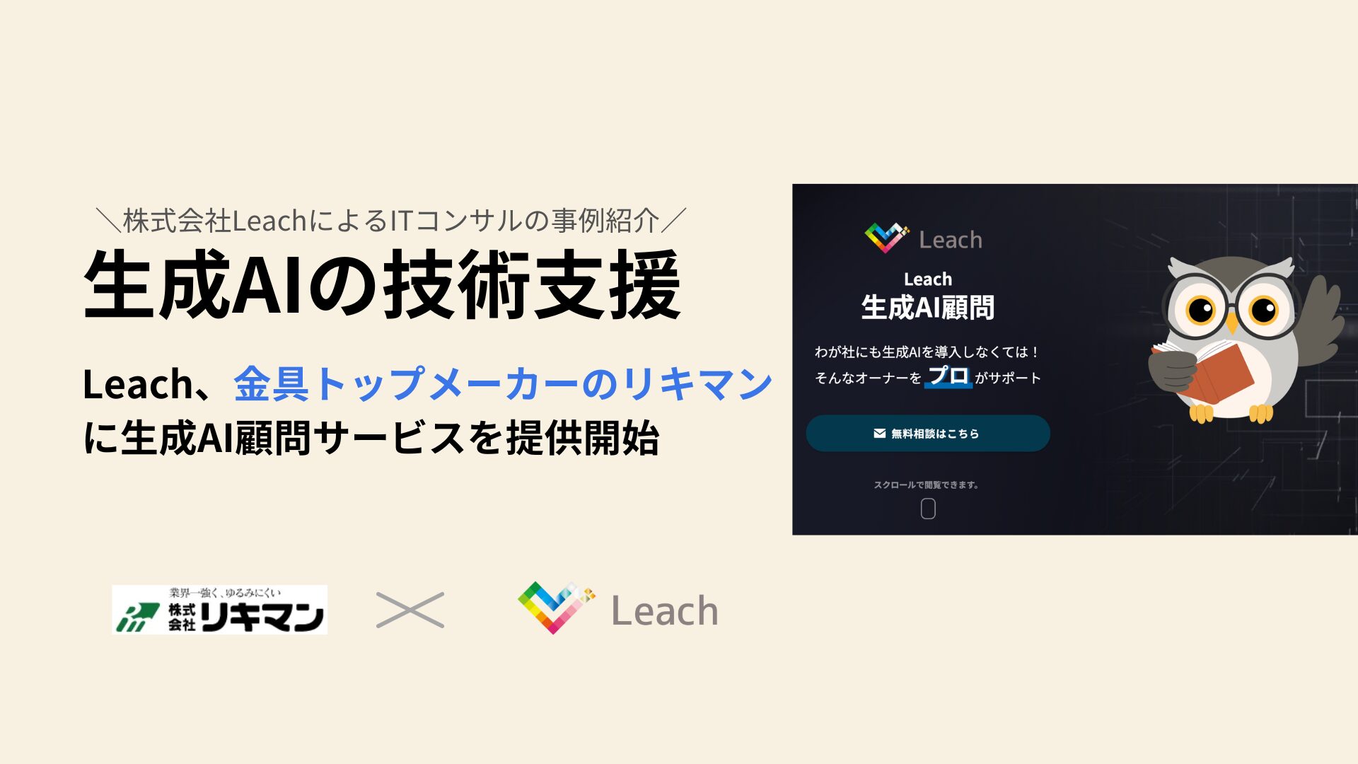 生成AI技術の教育、コンサルティングおよび開発を手掛ける株式会社Leach(本社:東京都港区、代表取締役:冨永 拓也、以下 Leach)は、重仮設向け締結金具で業界トップクラスのシェアを誇る株式会社リキマン(本社:福岡県粕屋郡須惠町、代表取締役:尾辻 元、以下 リキマン)に対し、生成AI導入支援を行うアドバイザリーサービス「Leach 生成AI顧問」の提供を開始しました。