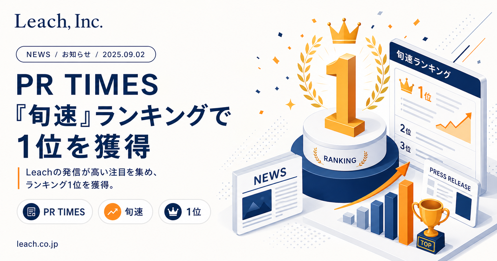 株式会社Leach(所在地:東京都、代表取締役:冨永 拓也、以下Leach)は、【配信日・時刻】に配信したプレスリリース「【タイトル差し替え】」が、PR TIMESサイトの**「旬速」ランキングで1位を獲得したことをお知らせします。「旬速」**とは、配信から2時間以内のプレスリリースを対象にしたアクセス数(PV)ランキングです。