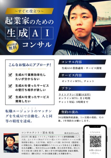 生成AI技術のコンサルティングおよび開発を手掛ける株式会社Leach(本社:東京都港区、代表取締役:冨永 拓也、以下 Leach)は、企業のデジタルトランスフォーメーション(DX)推進と競争力強化を目的とし、生成AIの導入・活用に関するあらゆる課題に対応する技術アドバイザリーサービス「Leach 生成AI顧問」の提供を本日より開始します。
