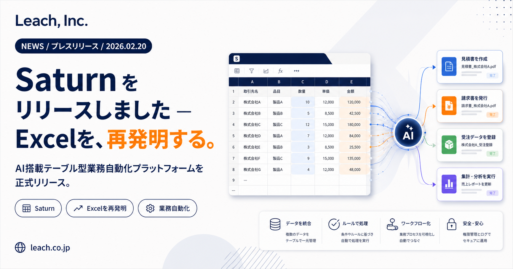 株式会社Leachは、AI搭載テーブル型業務自動化プラットフォーム「Saturn」を正式リリースしたことをお知らせいたします。